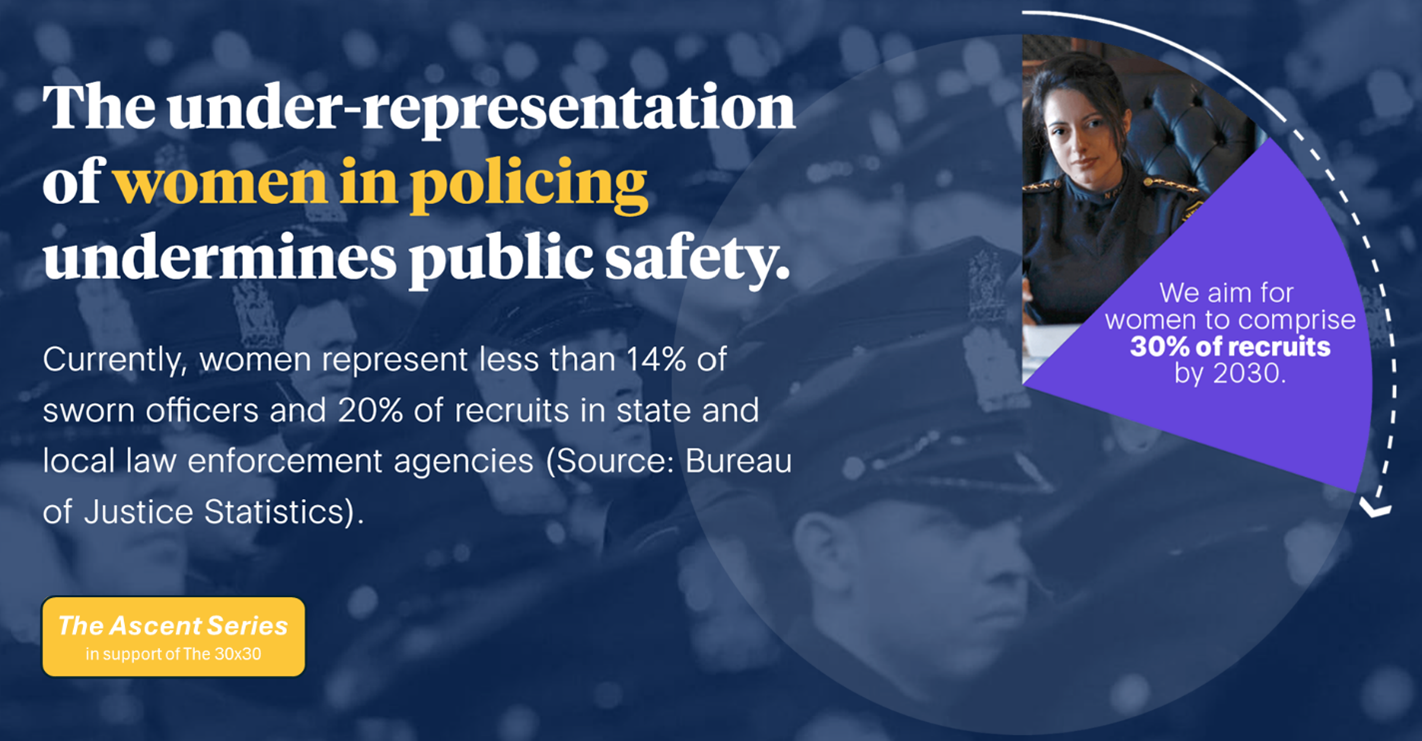According to the Bureau of Justice Statistics, women represent less than 14% of sworn officers and 20% of recruits in state and local law enforcement agencies. We support The 30×30 Pledge and the belief that this under-representation of women in policing undermines public safety. It is for this reason that The Leadership Ascent Series exists.